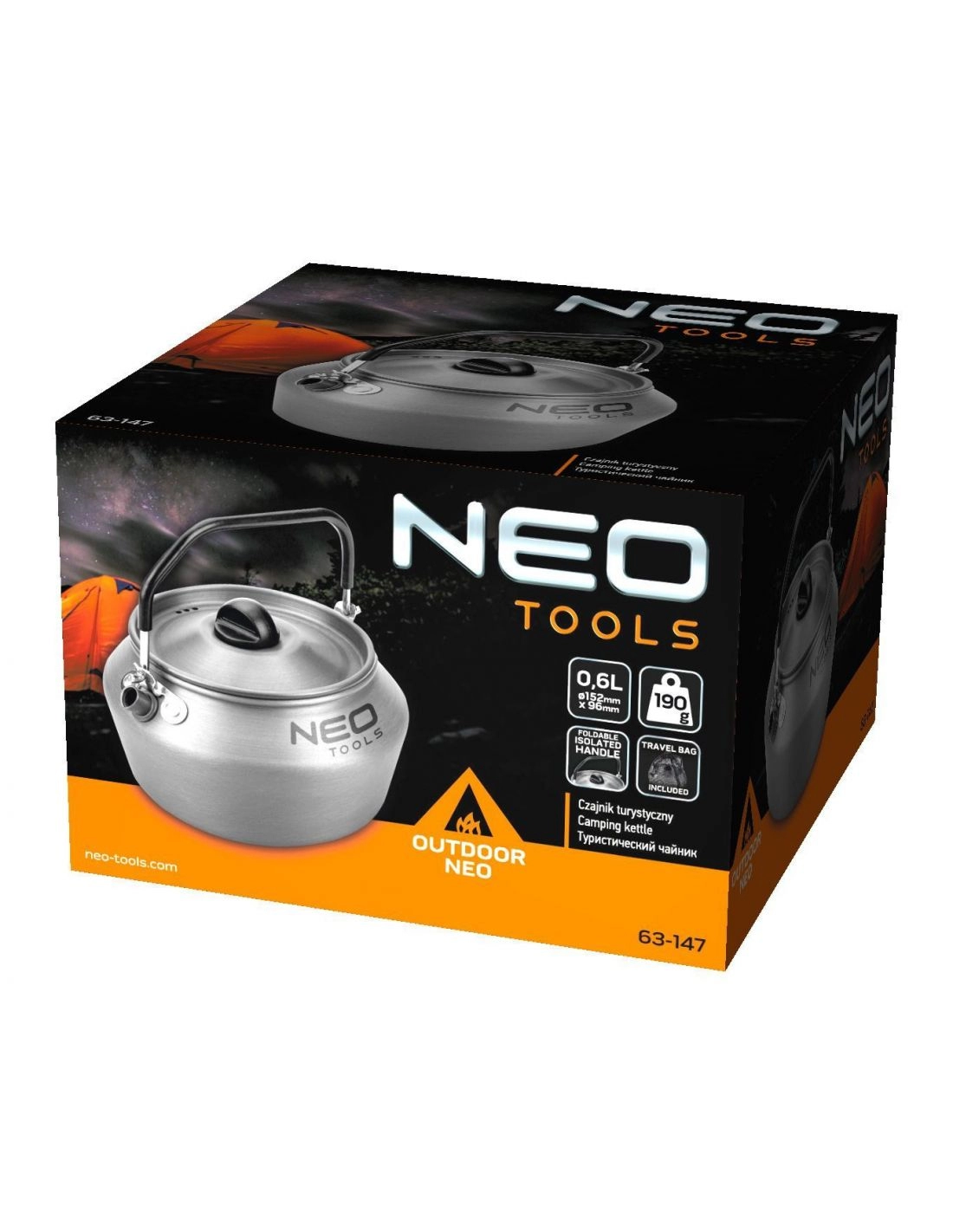 Składane uchwyty czajnika Neo Tools, izolowane materiałem zapewniającym ochronę przed gorącem, są wyjątkowo praktyczne i pozwalają na oszczędność miejsca. Czajnik Neo Tools został wyposażony w pokrywkę z trzema otworami które skutecznie odprowadzają parę podczas gotowania wody, szeroki wlew czajnika turystycznego Neo Tools ułatwia napełnianie wodą i sprawia, że jest bardzo praktyczny. Ponadto, w zestawie znajduje się torba transportowa, która chroni czajnik przed zabrudzeniami podczas podróży.