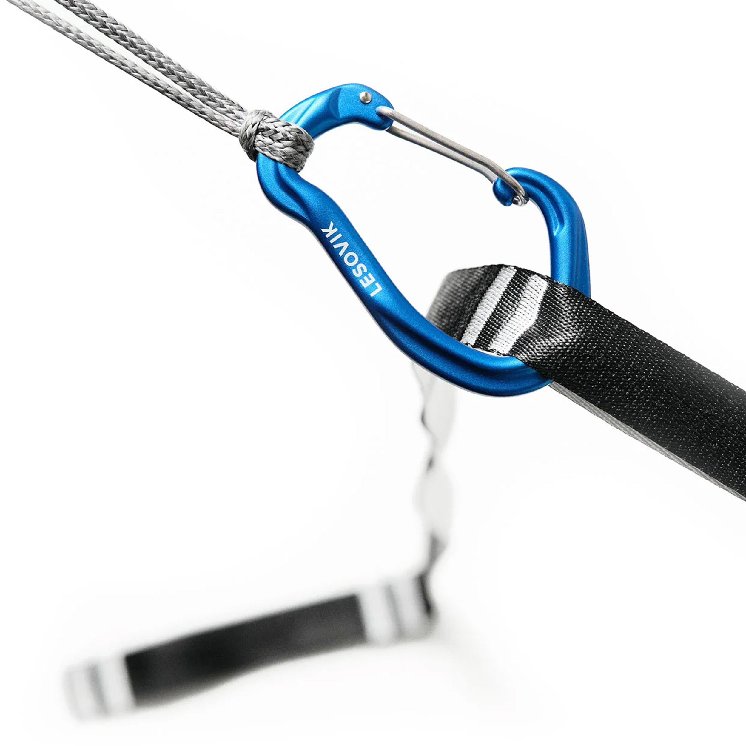 - Wykonane z ultralekkich materiałów – taśmy Dyneema i aluminiowe karabinki.