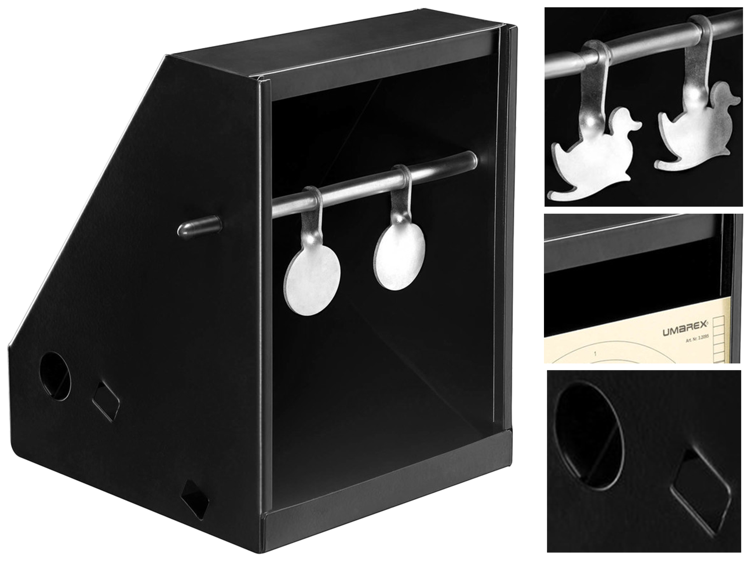 W zestawie z kulochwytem znajdują się 4 wymienne cele metalowe2 kaczki oraz 2 obrotowe wahadła o średnicy 35 mm, które dostarczają świetnej zabawy oraz pozwalają trenować celność i szybkość reakcji. Dzięki zastosowaniu systemu rynienek, wymiana tarcz odbywa się błyskawicznie i nie wymaga żadnych narzędzi. Kulochwyt jest w pełni kompatybilny ze standardowymi tarczami papierowymi o wymiarze 17×17 cm, a w zestawie znajdziesz również 10 gotowych tarcz do natychmiastowego użytku.