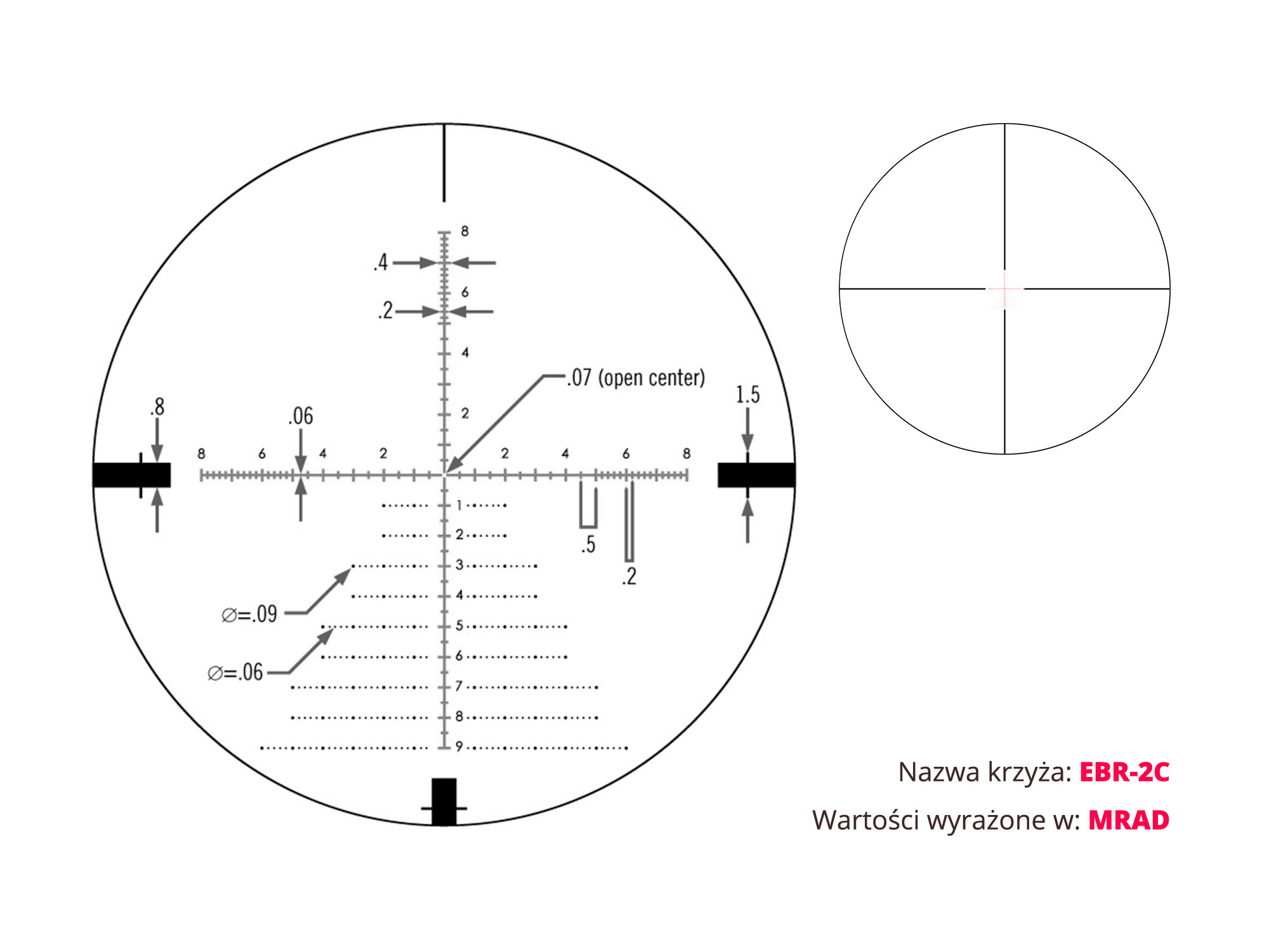- Krzyżowi EBR-2C FFP – umożliwia precyzyjne celowanie na dowolnym powiększeniu. Skala krzyża pozwala na wyznaczanie odległości, korekty na wiatr oraz opad pocisku z niezwykłą dokładnością.