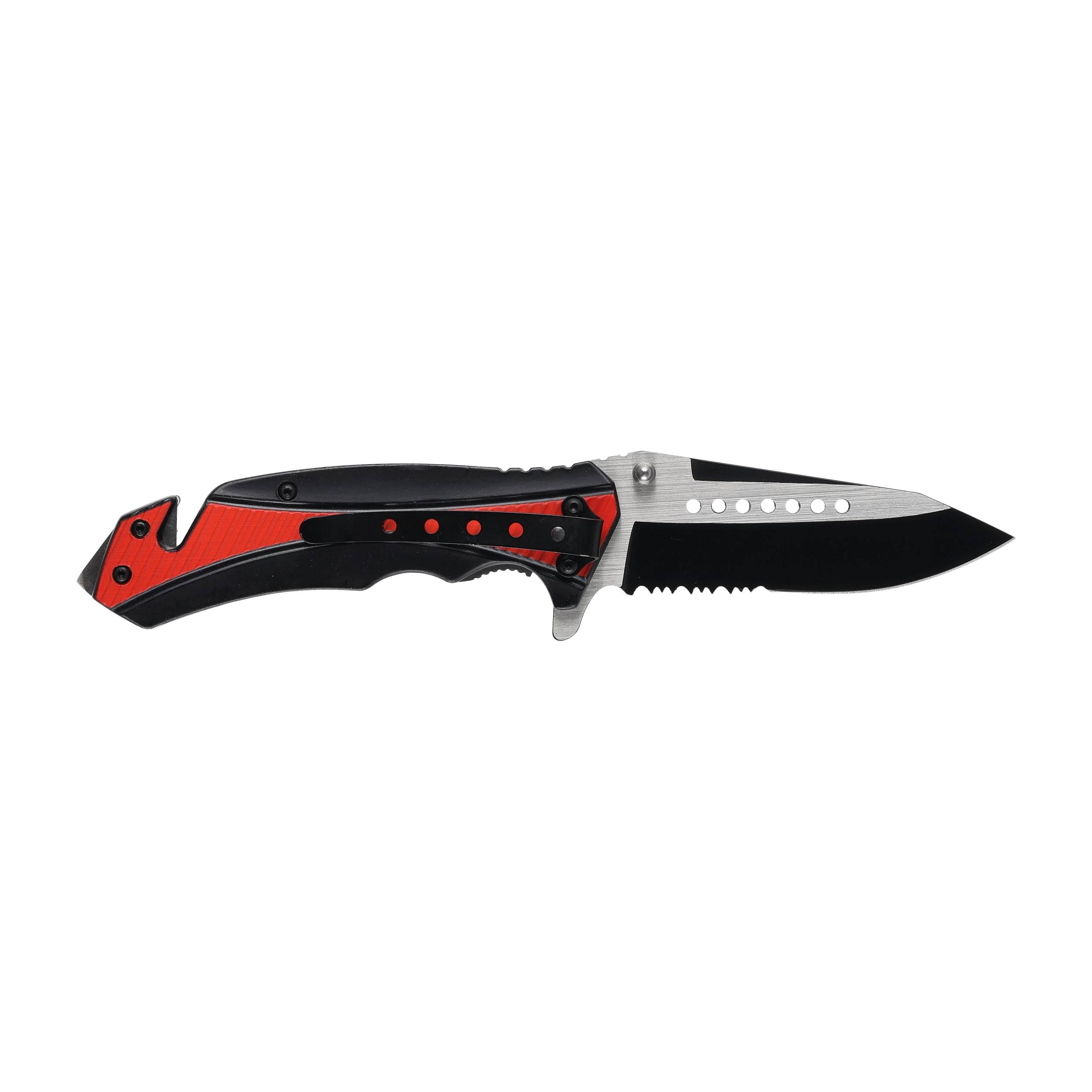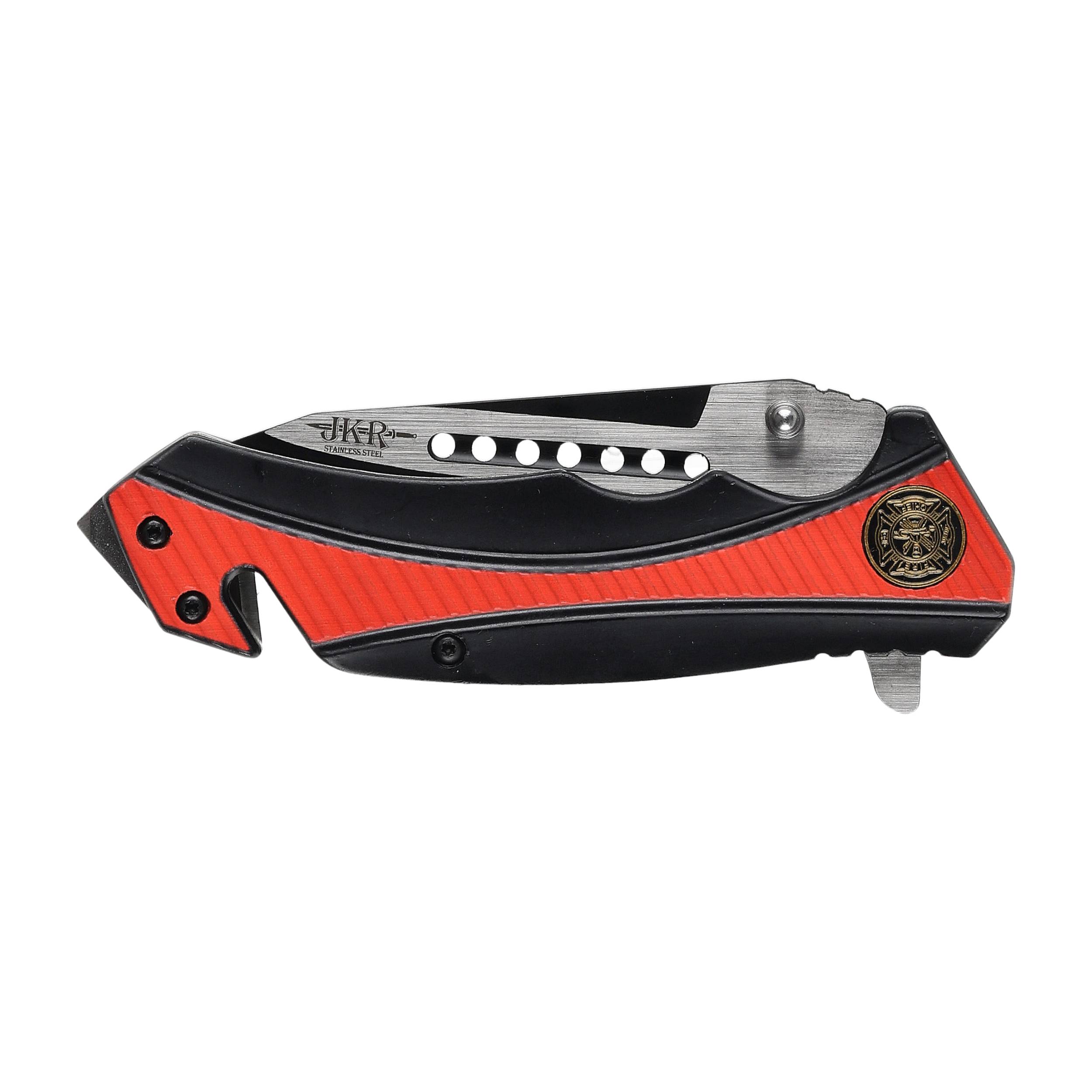 Rękojeść noża została zaprojektowana z myślą o komforcie i bezpieczeństwie użytkowania. Wykonana ze stali, została pokryta aluminiowymi okładzinami w intensywnym czerwonym kolorze, który ułatwia szybkie zlokalizowanie noża w nagłych sytuacjach. Na okładzinach znajduje się grafika przedstawiająca symbol straży pożarnej, co podkreśla ratowniczy charakter narzędzia.