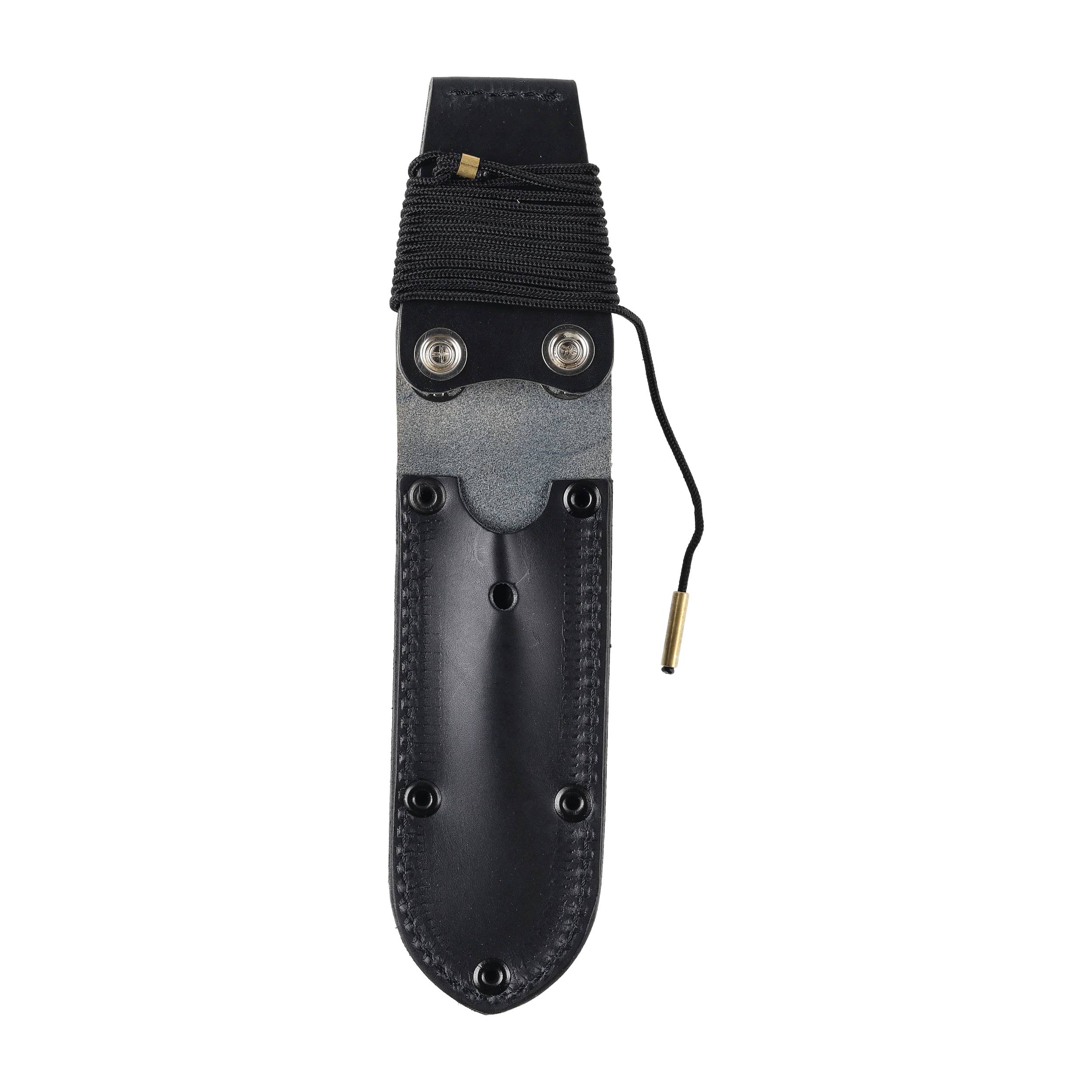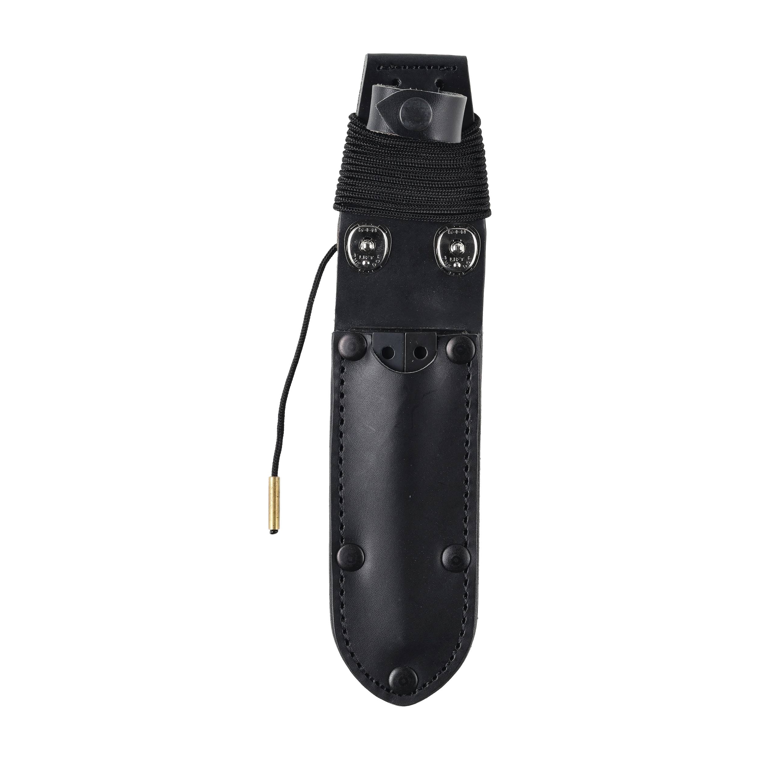 Pochwa wykonana jest ze skóry wybarwionej na czarno, brzegi zostały obszyte i wzmocnione metalowymi zaciskami, a zabezpieczenie przed przypadkowym wypadnięciem noża stanowi pasek z klipsem oraz metalowa klamra wewnątrz pochwy.