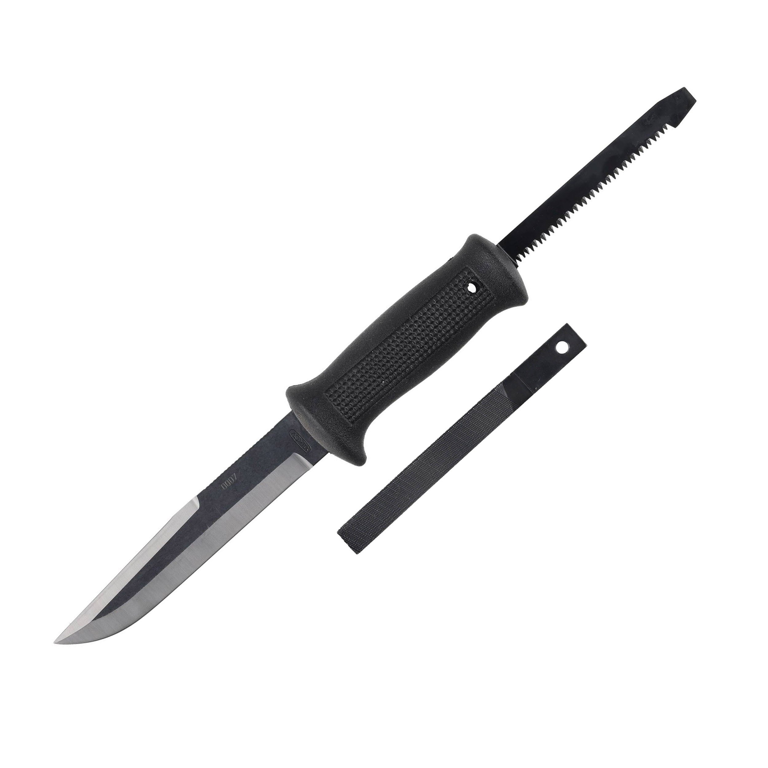 Serce zestawu stanowi nóż z głownią wykonaną ze stali nierdzewnej typu 420 o twardości 53‑55 HRC, co gwarantuje dobrą odporność na korozję oraz trwałość ostrza. lamnia.com+2kapesni-noze.cz+2 Rękojeść została wykonana z odlewu utwardzanej gumy, pokrytej antypoślizgowymi wypustkami — dzięki temu pewnie leży w dłoni nawet przy warunkach mokrych lub śliskich. W rękojeści znajduje się także otwór umożliwiający mocowanie linki/paracordu lub dodatkowych narzędzi.