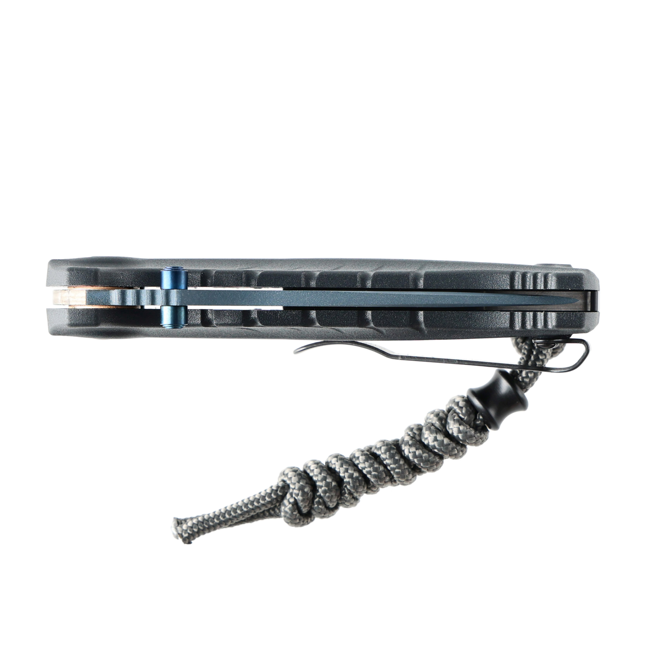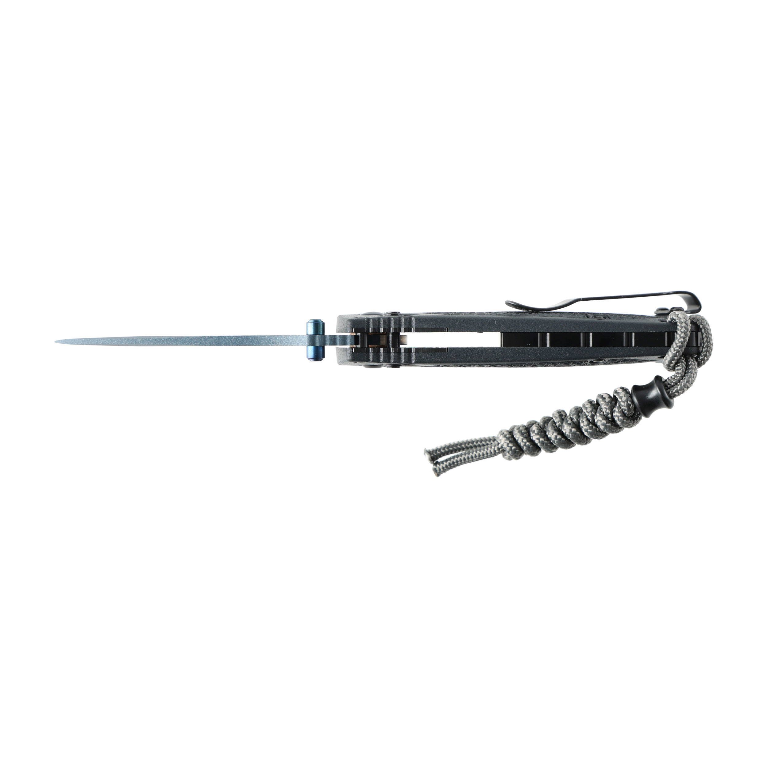 Nóż wyposażony jest w klips z możliwością przełożenia na lewą lub prawą stronę, co zwiększa wygodę przenoszenia. Dodatkowy otwór na linkę umożliwia zamocowanie dołączonego temblaka z paracordu w kolorze pomarańczowym, ułatwiającego chwyt i zabezpieczającego przed zgubieniem.