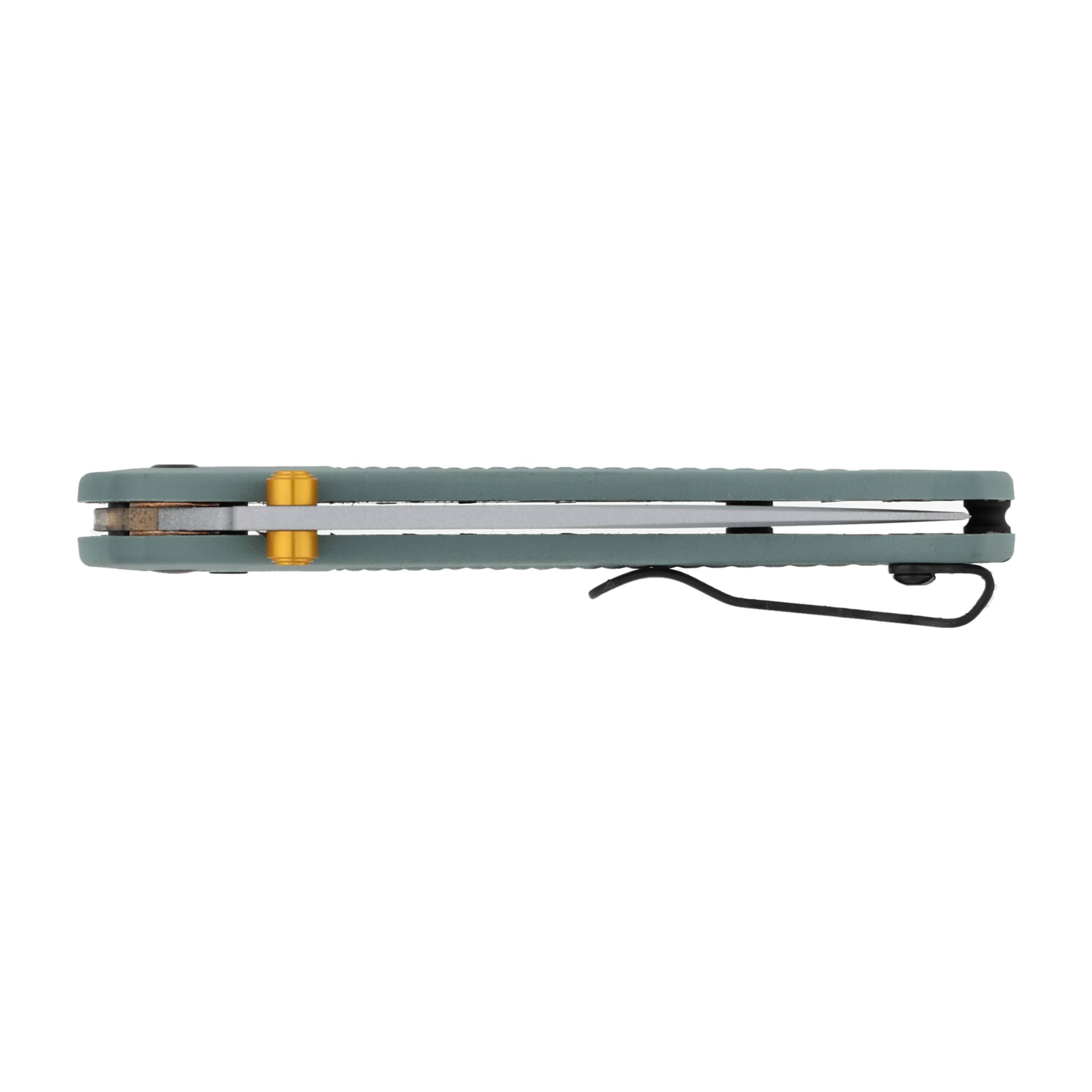 Jednym z największych atutów Benchmade Mini Bugout jest jego lekkość – nóż waży zaledwie 42,5 g, dzięki czemu praktycznie nie czuć go w kieszeni. Rękojeść wykonano z tworzywa Grivory, które cechuje się wysoką wytrzymałością i odpornością na uszkodzenia. Teksturowane, antypoślizgowe okładziny gwarantują pewny chwyt nawet w wilgotnych warunkach. Brak metalowych linersów dodatkowo redukuje wagę, a smukły profil rękojeści sprawia, że Mini Bugout doskonale leży w dłoni i łatwo mieści się w kieszeni.
