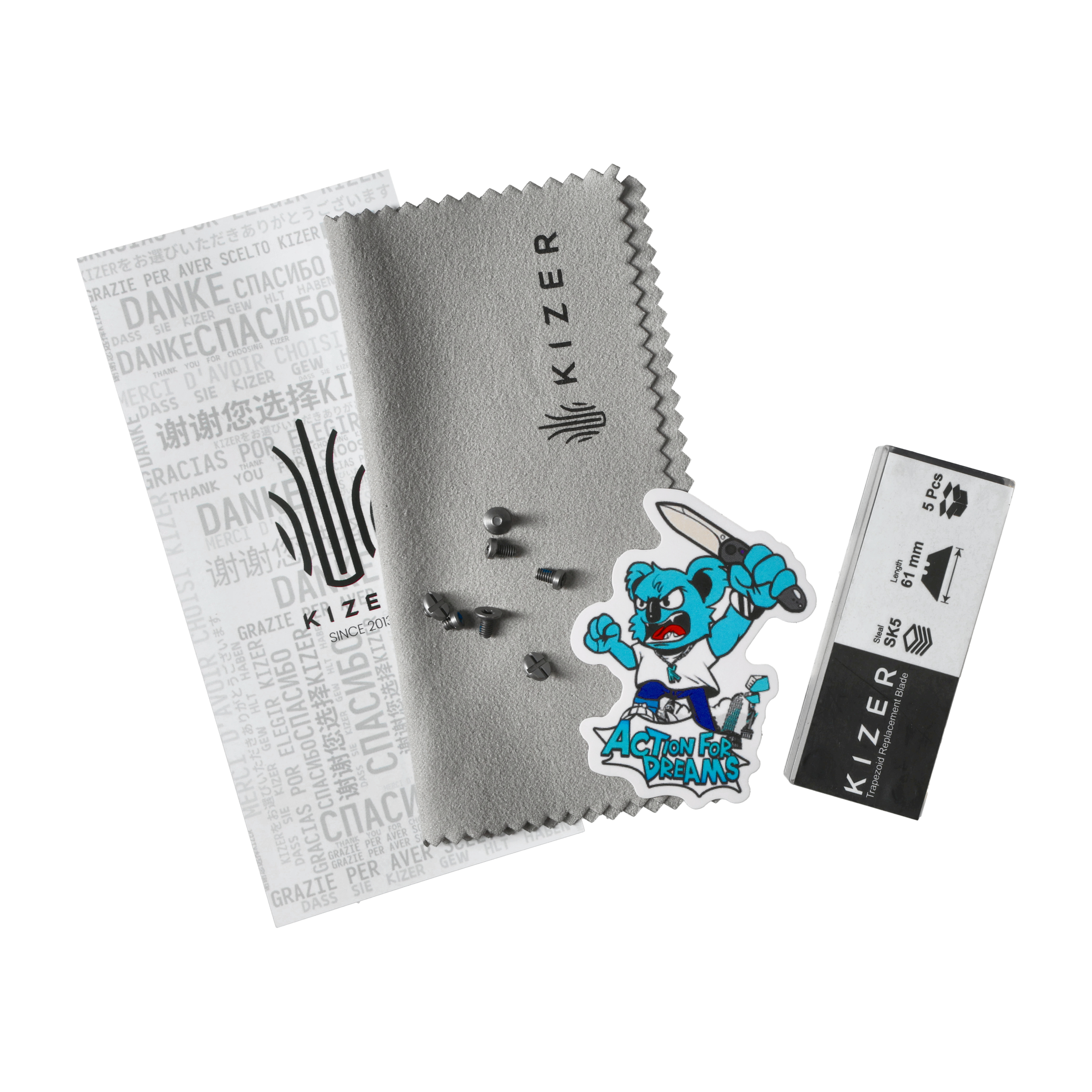 W modelu Kizer C01C Uti 1 V3488.29JSA1 zastosowano ostrze o długości 70,5 mm, wykonane ze stali 5Cr15MoV, a w zestawie znajdują się zapasowe ostrza ze stali SK5. Twardość 56–58 HRC zapewnia bardzo dobry kompromis pomiędzy odpornością na zużycie a łatwością konserwacji.