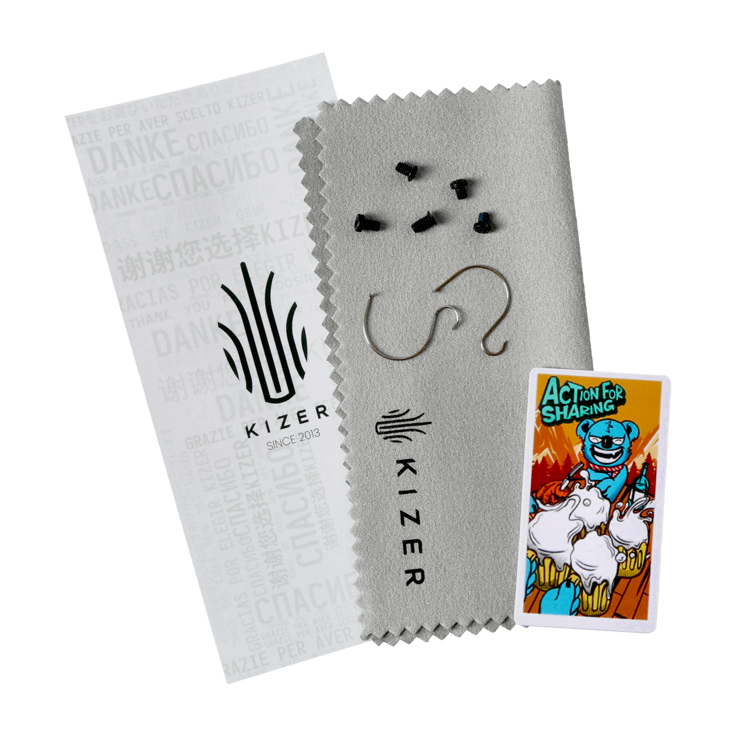 Model Kizer Mini Bulldog V3672SA1 wyposażono w blokadę Clutch Lock, która dzięki zastosowaniu obustronnego bolca w rękojeści, pewnie blokuje ostrze po otwarciu. Rozkładanie noża odbywa się za pomocą kołka pod kciuk, co zapewnia komfortową obsługę zarówno osobom prawo-, jak i leworęcznym.