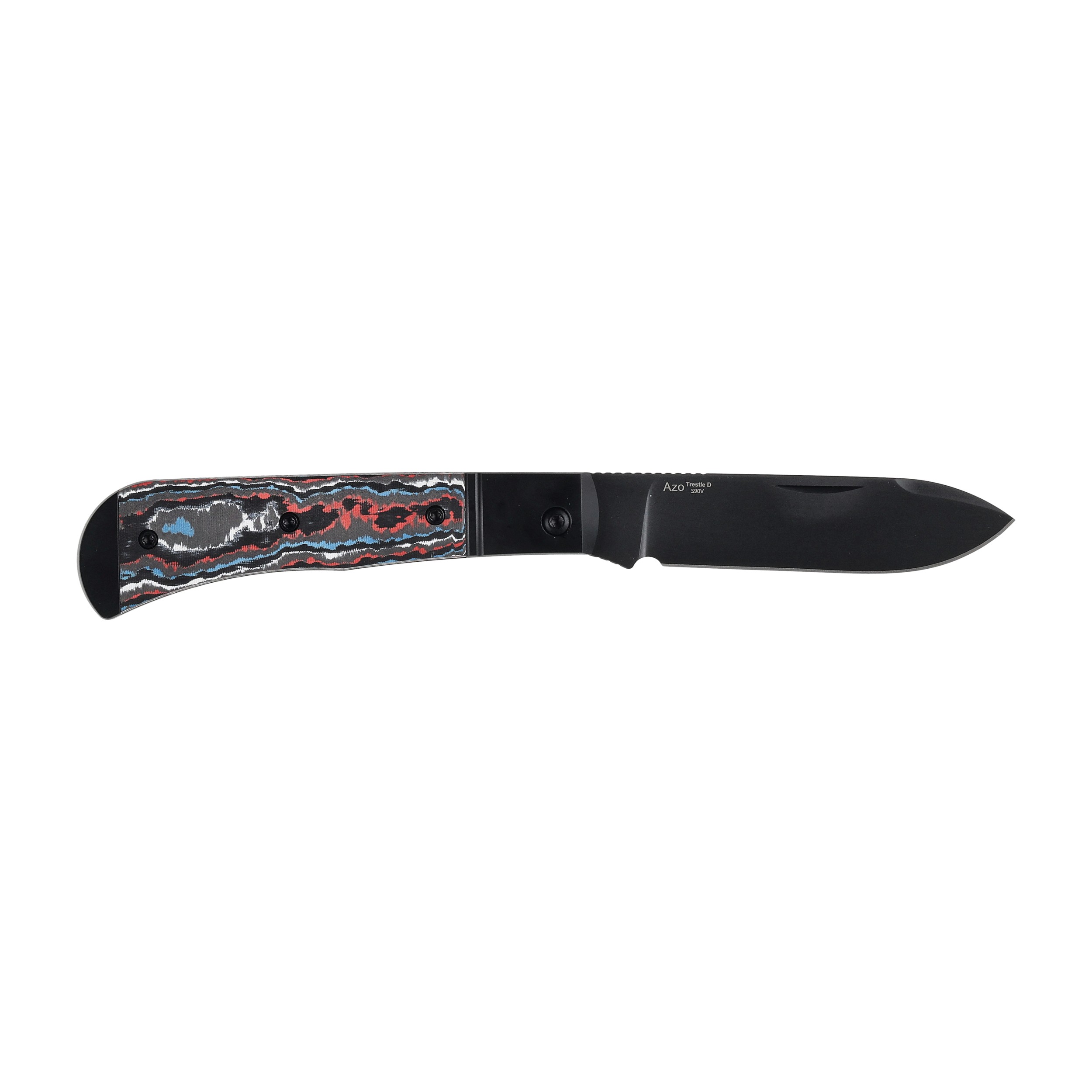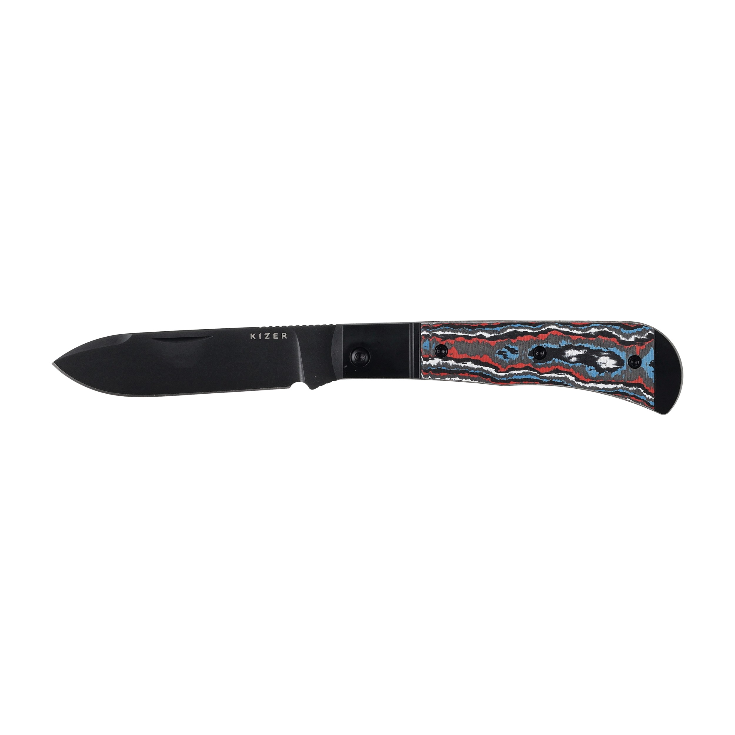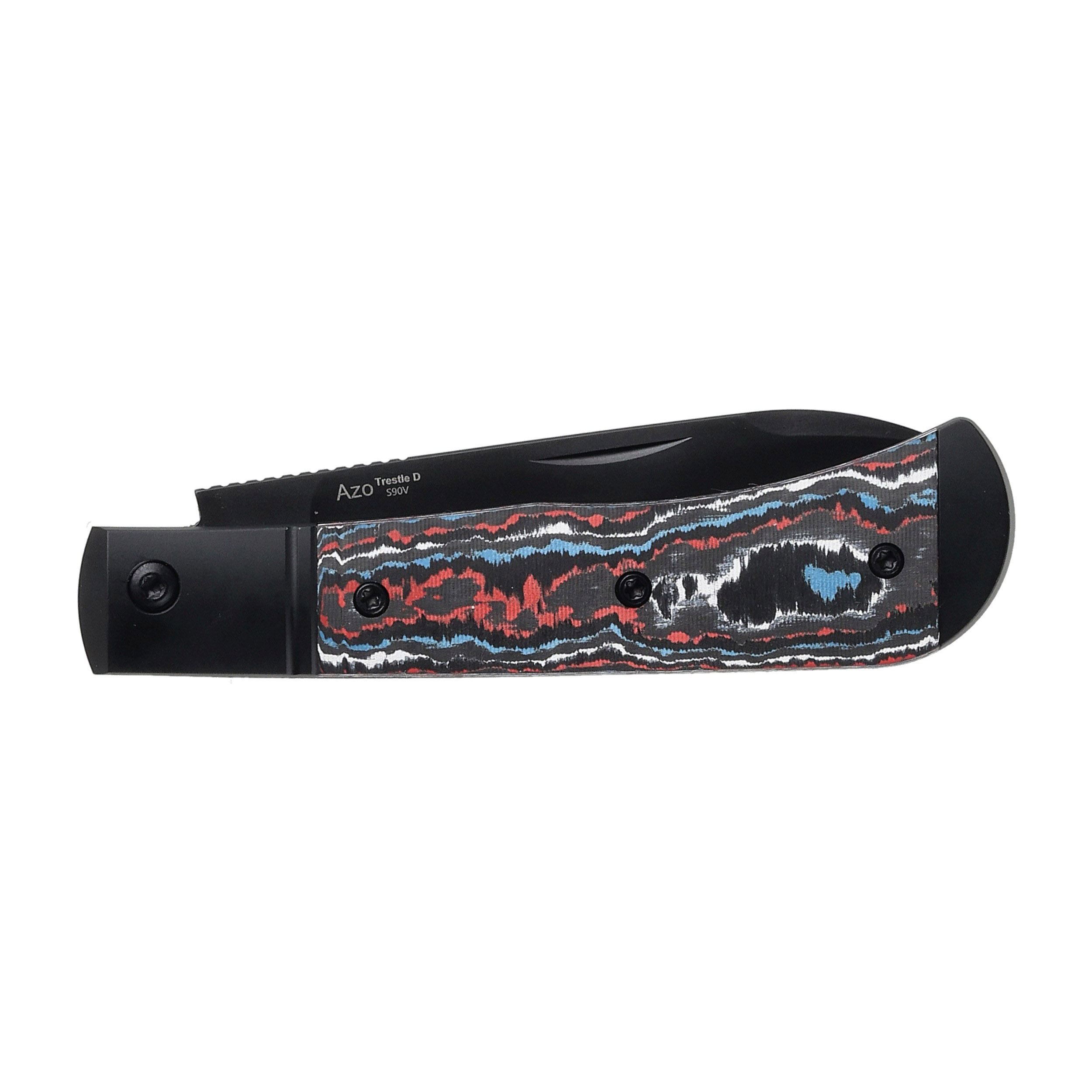 Rękojeść Kizer Trestle D Ki3760A1 to wyjątkowe połączenie aluminiowych bolsterów z efektownymi okładzinami z Fat Carbon. Ten materiał wyróżnia się artystycznym układem kolorów – bieli, czerni, błękitu i czerwieni – dzięki czemu każdy egzemplarz noża jest unikalny i niepowtarzalny.