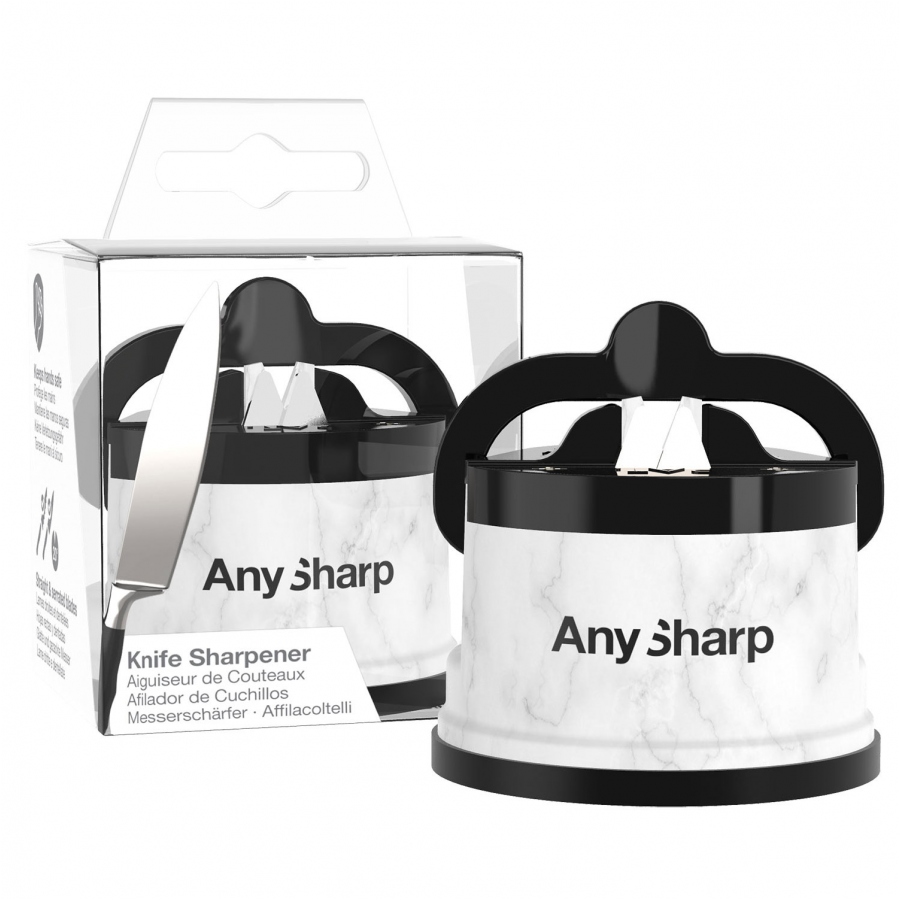 Bardzo skuteczna i prosta w obsłudze ostrzałka do noży. Sekretem ostrzałek AnySharp® są trójkątne płytki ostrzące wykonane z węglika wolframu, który jest niezwykle wytrzymałym materiałem, powstałym wskutek syntezy metalicznego wolframu i węgla w temperaturze do 2000 °C. Twardość tego materiału jest porównywana do diamentu czyli najtwardszego materiału na Ziemi. Właśnie z tego powodu skrawanie ostrza noża jest możliwe i efektywne. Płytki w całości zostały wykonane z węglika wolframu dzięki czemu przewyższają konkurencję żywotnością. Ostrzałka jest wyposażona w gumową przyssawkę z dźwignią PowerGrip®, która zapewnia stabilizację i bardziej precyzyjny proces ostrzenia. Ostrzałka ma prostą konstrukcję z wykończeniem imitującym marmur.