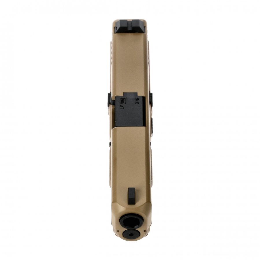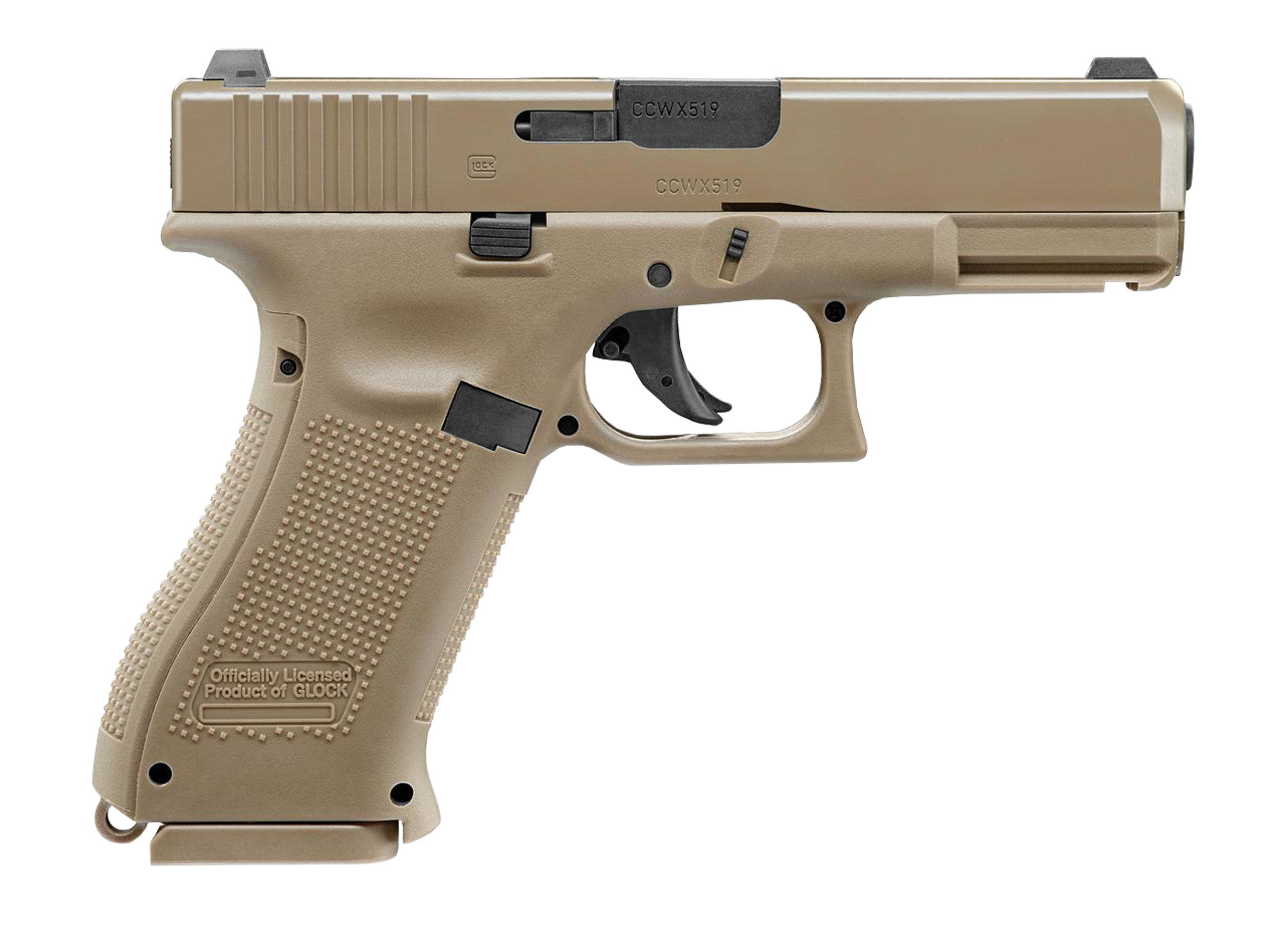 Glock 19X 4,5 mm Coyote BB CO2 to pistolet wykonany w większości z wytrzymałego polimeru, co zapewnia jego lekkość i trwałość. Na szkielecie i zamku znajdują się licencjonowane oznaczenia firmy Glock, nadając wiatrówce autentyczny charakter. Teksturowana rękojeść z moletowaniem umożliwia pewny i stabilny chwyt, a obustronna dźwignia zrzutu zamka oraz bezpiecznik nastawny dodają realizmu i wygody.