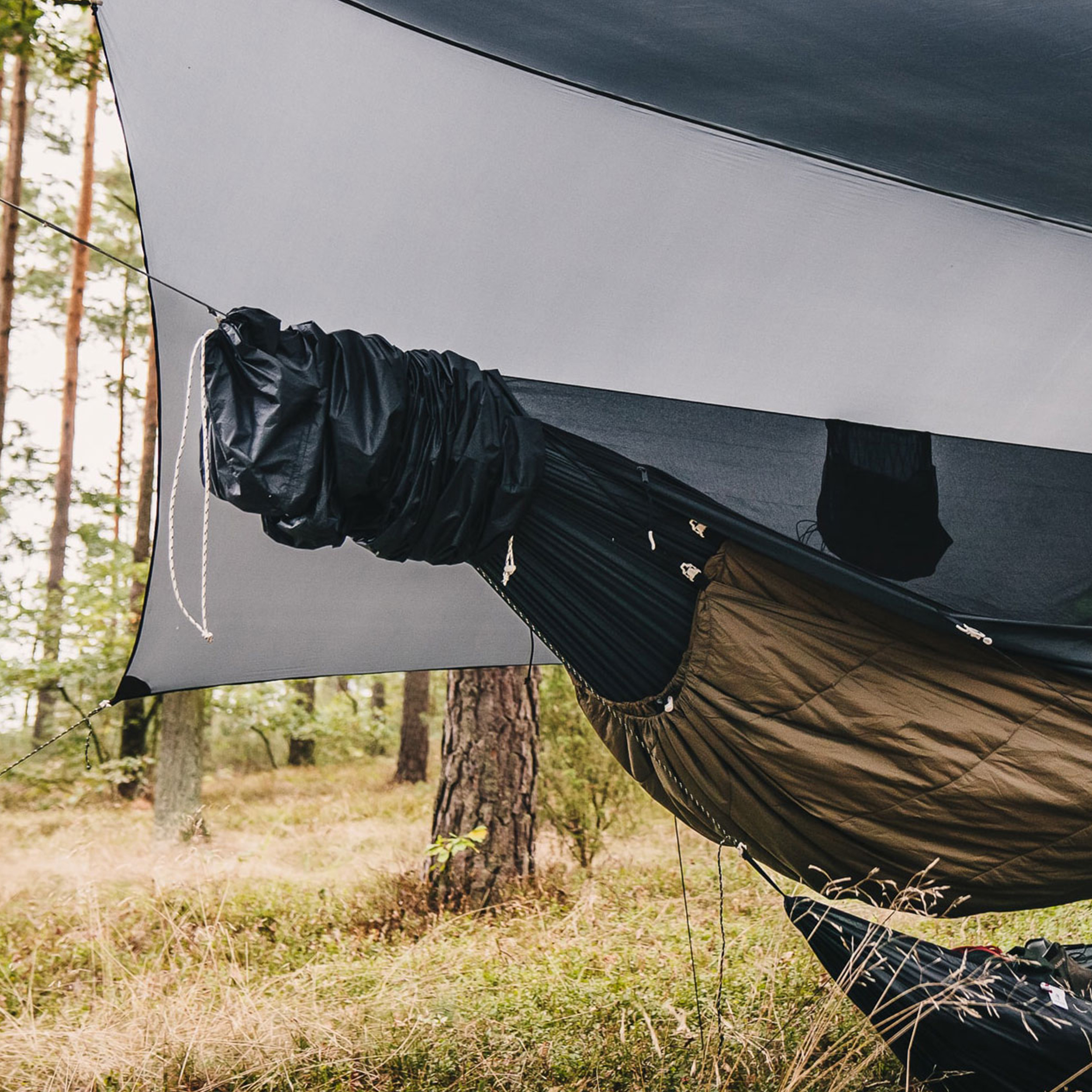 Po zakończonym biwaku składanie sprzętu jest równie proste – wystarczy naciągnąć pokrowiec na rozwieszony hamak i odpiąć go od drzew. Brudne taśmy można schować do oddzielnych kieszonek, dzięki czemu reszta wyposażenia pozostaje czysta.