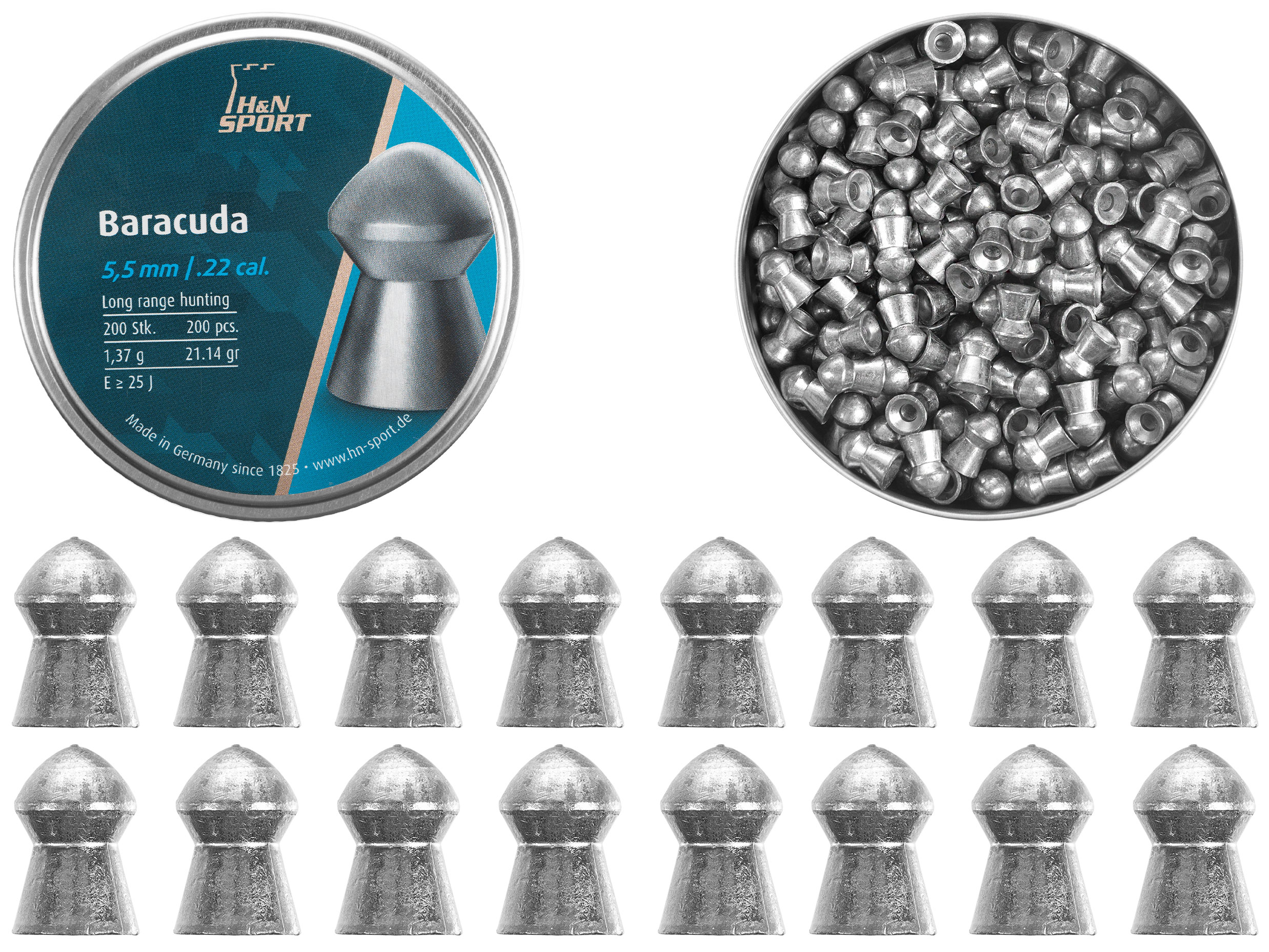Śrut H&N Baracuda 5,5 mm to wysokiej klasy amunicja przeznaczona do strzelania precyzyjnego i konkurencji Field Target, a także do rekreacyjnych strzelań długodystansowych. Jego największą zaletą jest duża masa 0,88 g, dzięki której śrut zachowuje stabilny tor lotu, cechuje się wysoką energią uderzenia i ograniczoną podatnością na podmuchy wiatru.