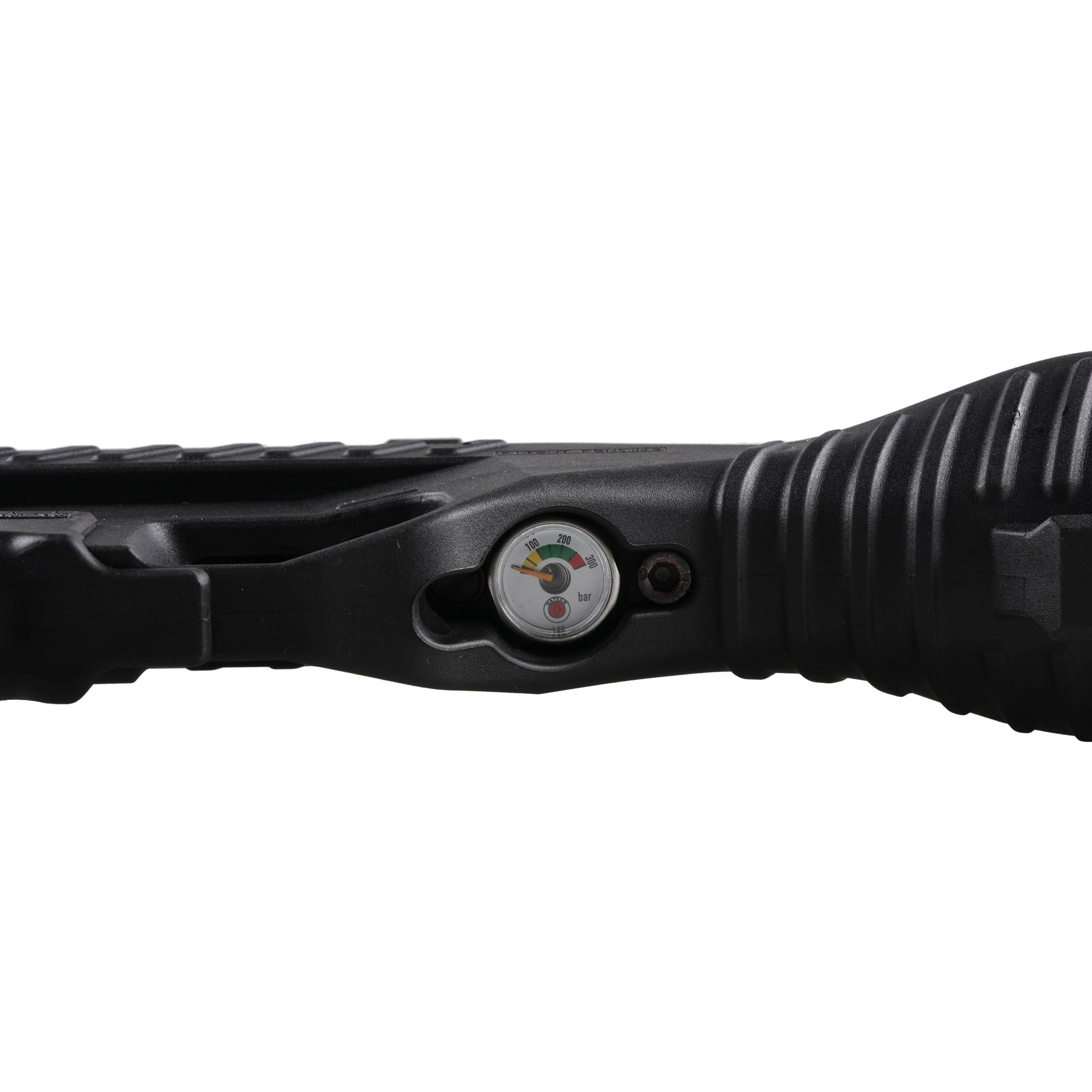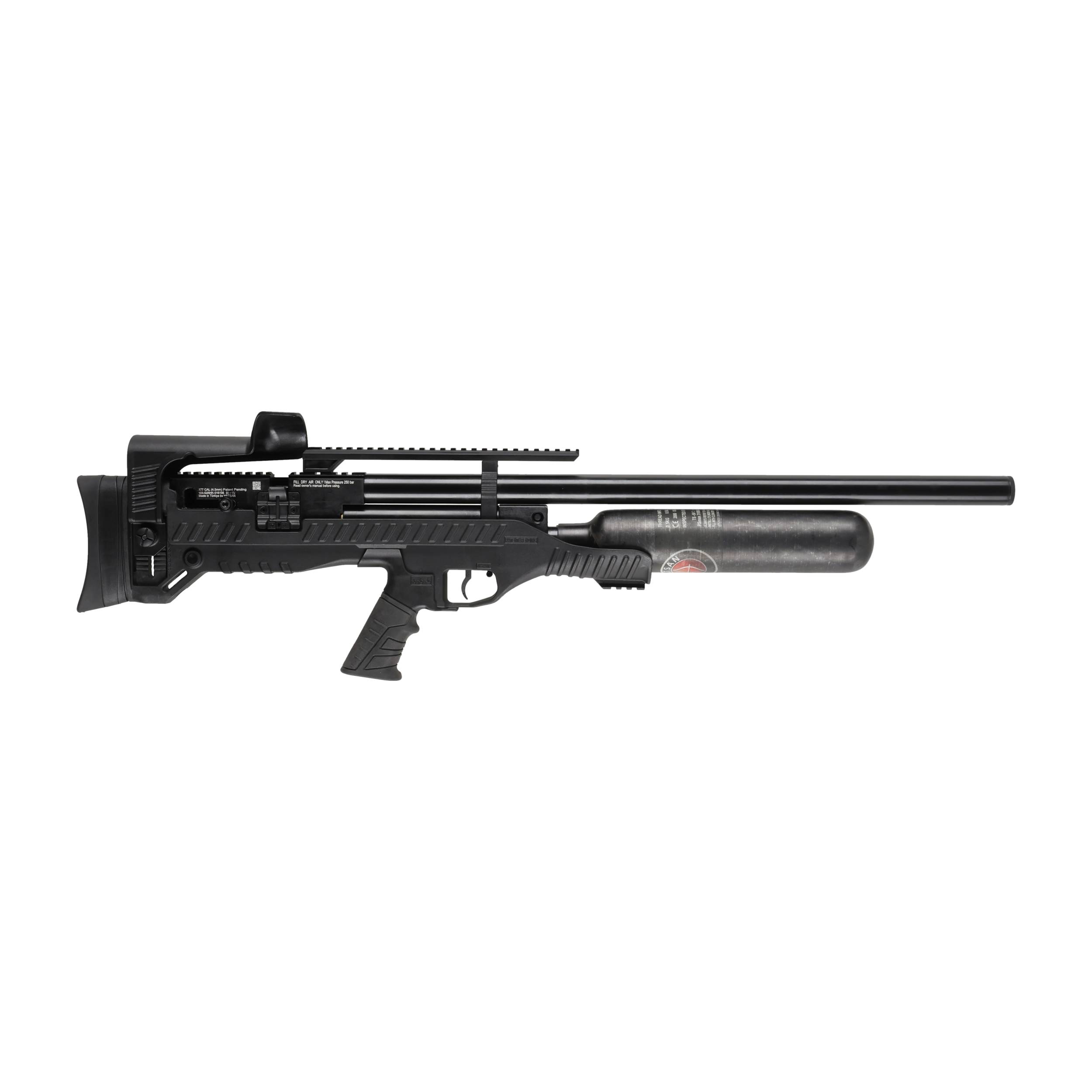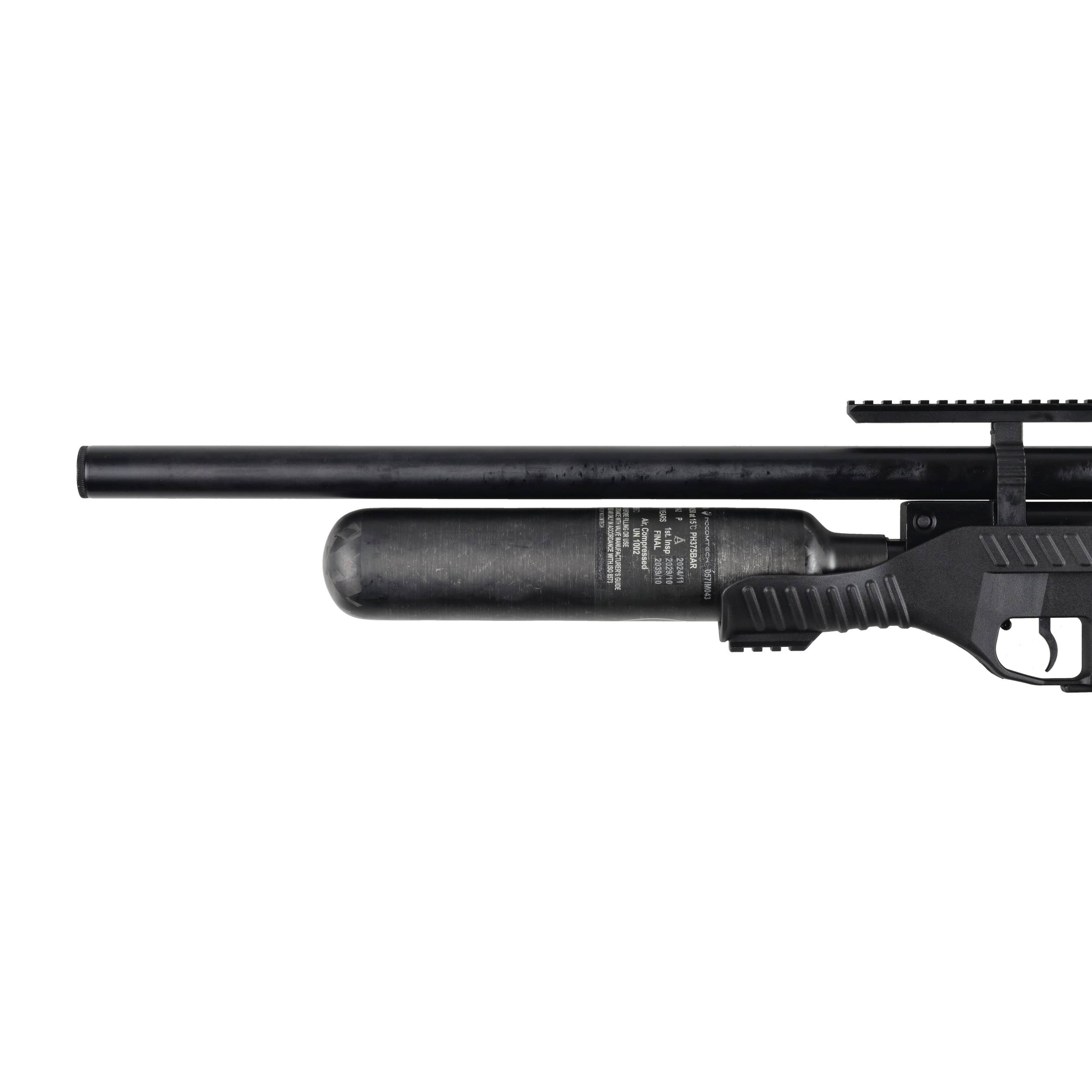 Zasilanie odbywa się z kartusza o pojemności 580 cm³, wykonanego z włókna węglowego, przy maksymalnym ciśnieniu roboczym 250 bar. Jedno napełnienie pozwala na oddanie do 165 strzałów, a zintegrowany manometr umożliwia stałą kontrolę poziomu powietrza.