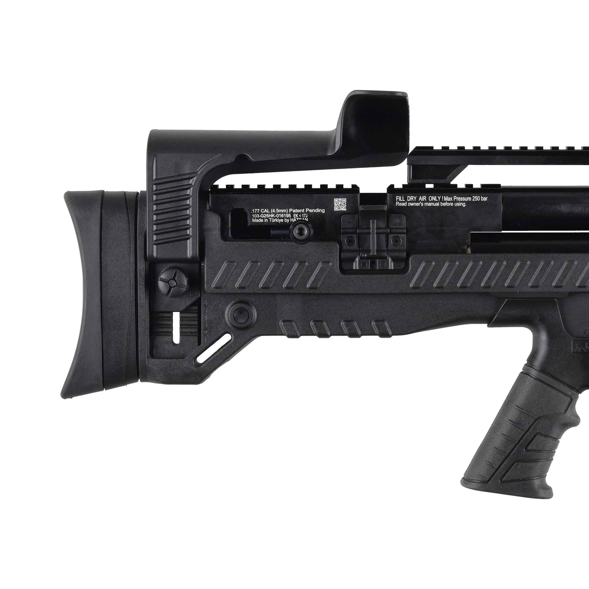 Układ BullPup umożliwił skrócenie całkowitej długości do 905 mm przy zachowaniu pełnowymiarowej lufy. Masa 4000 g stabilizuje karabinek pneumatyczny podczas dynamicznego strzelania.