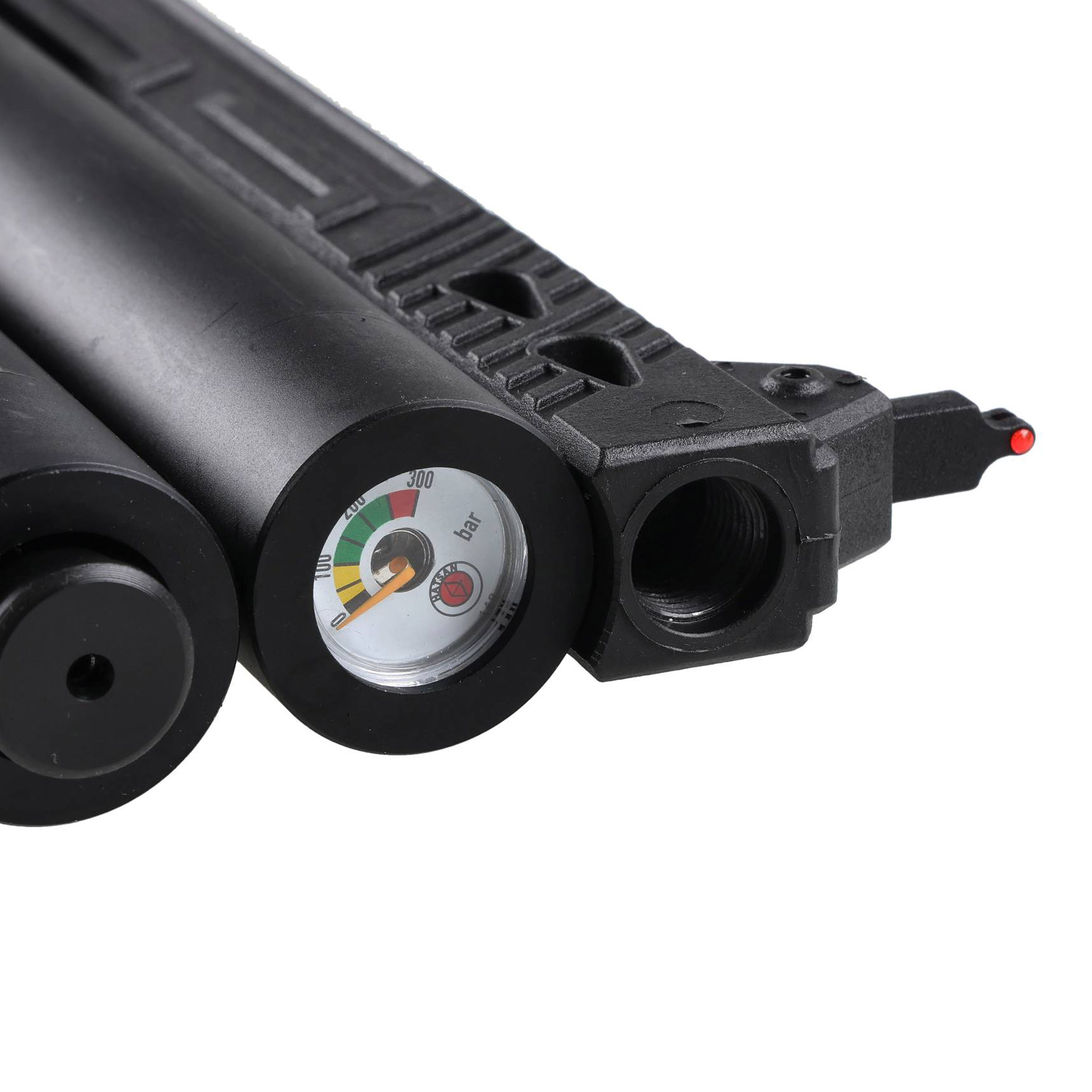 Zintegrowany manometr umożliwia bieżące monitorowanie poziomu ciśnienia, zwiększając bezpieczeństwo i kontrolę nad parametrami pracy. System PCP zapewnia płynność działania i stabilność osiągów, co jest szczególnie istotne przy strzelaniu na dalszych dystansach.